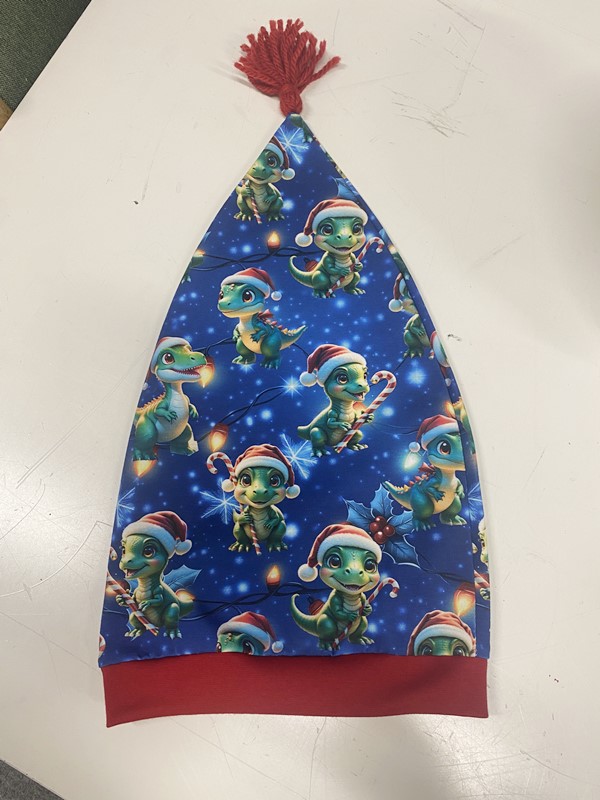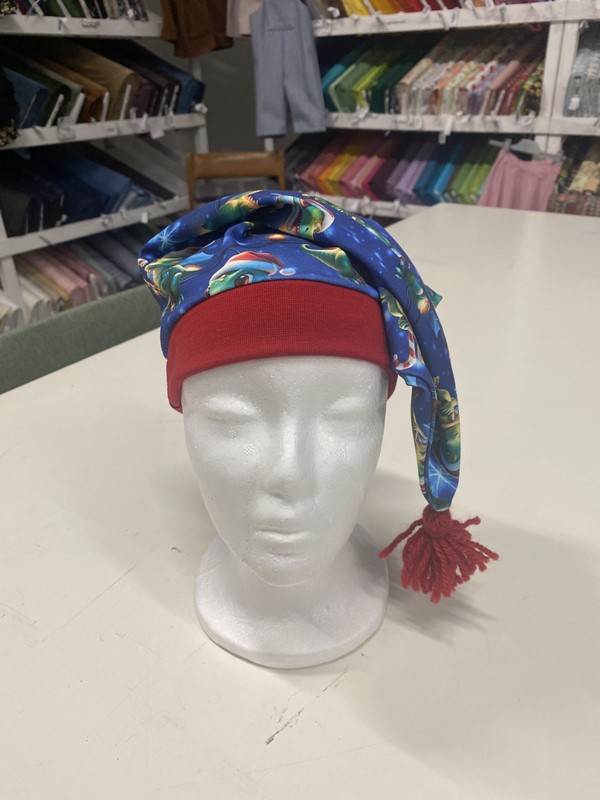 Nissehue syet i bomuldsjersey med ribkant og garnkvast.