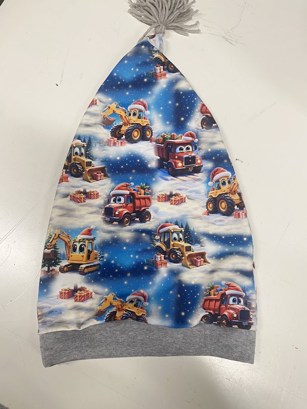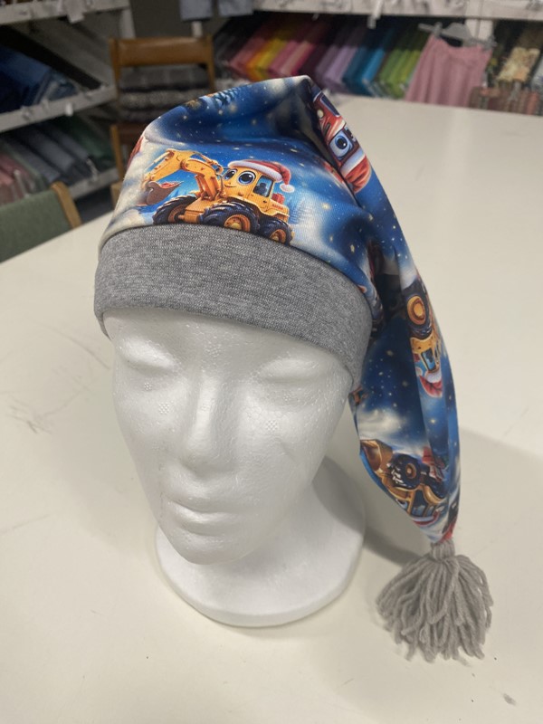 Nissehue syet i bomuldsjersey med ribkant og garnkvast.