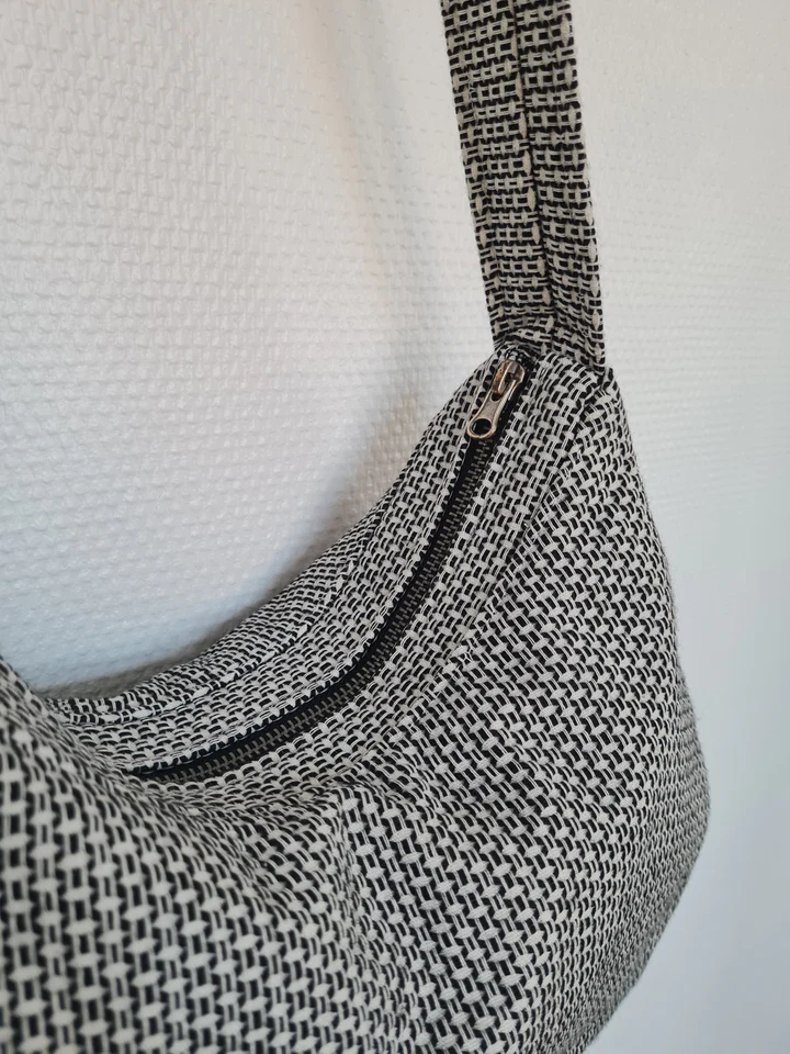 Du kan bruge mange forskellige stofkvaliteter til at sy denne taske, men den bliver pænest i en lidt kraftig vævet kvalitet.